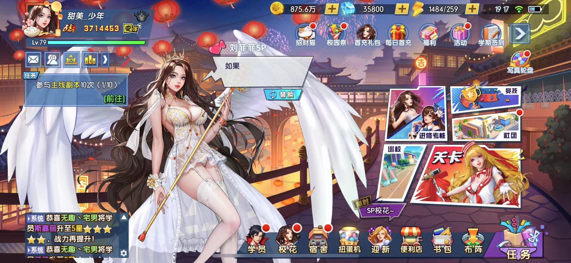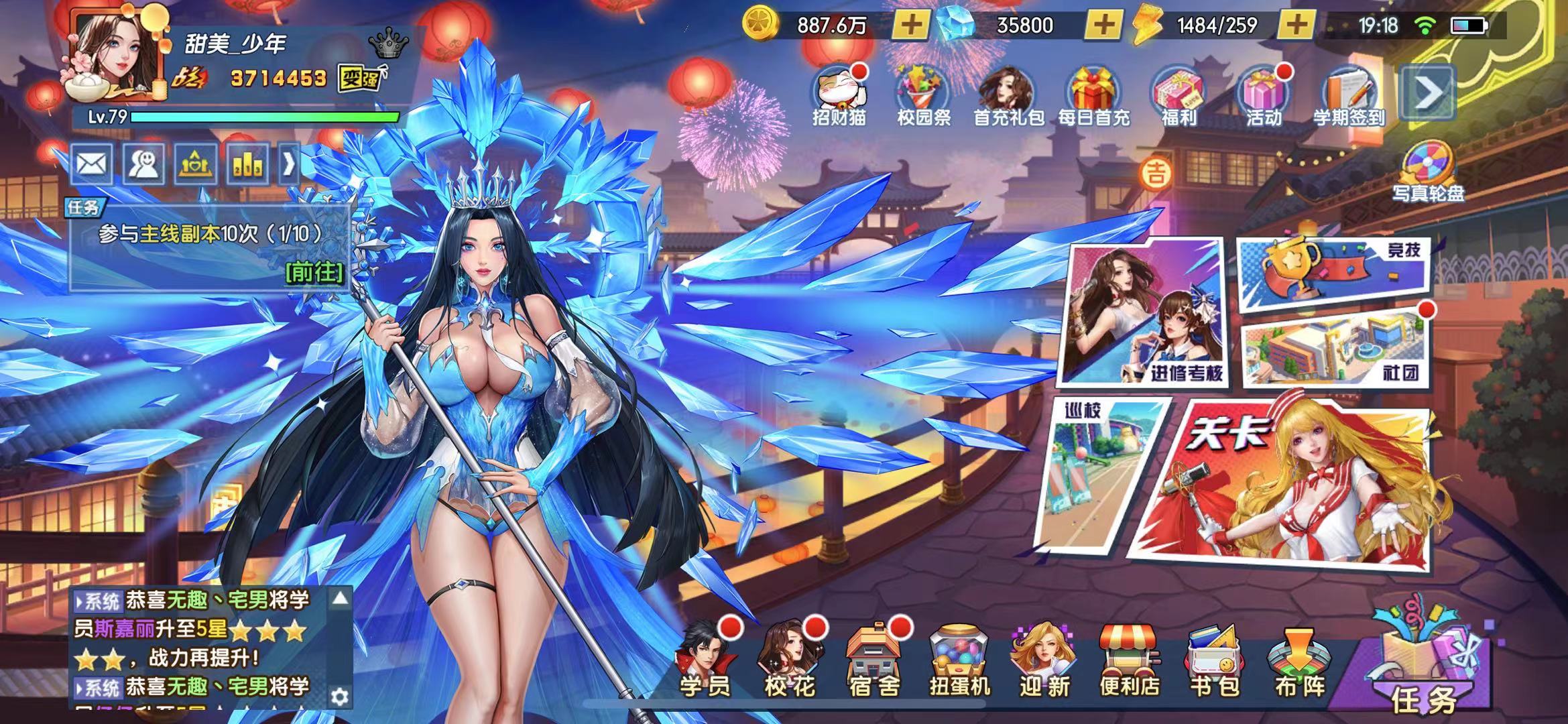 去年10月份就一直被一款游戏迷住,没花什么钱,游戏制作也挺不错的,典型的套皮卡牌游戏,里面有许多美女角色,着装也挺暴露的。男人嘛,玩手游不就冲着点这种精神福利来的嘛!几乎每天都要上去玩一下,把所有游戏流程走一遍才退出游戏,一晃眼,261天过去了,就在26号收到系统消息,说这个服是体验服,要关闭了,让所有玩家都转去公测服玩,而且还要重新注册角色,你麻痹啊!劳资辛辛苦苦玩了9个月说关就关。每天都要签到,生怕漏了一天!好在游戏也玩得差不多了,所有人物都集齐了!包括5个世界小姐,8个校花。后期都是在升级战力!说真的,很难有一款游戏能让我坚持玩9个月,每天都上去玩个半小时到1小时。这个王牌高校游戏是我第一个沉迷的手游。以前玩那些游戏能坚持玩半个月就不错了!这游戏的特点是流程短、制作精美,适合我这种平时比较忙,闲暇时玩一下的玩家。不会耗费我大量时间精力。这也是我沉迷这款游戏9个月的主要原因。当然,那5个爆乳的世界小姐也是我不断上游戏的原因之一。30号晚上23点59分关服,也好,做个了断,爷青结,我和其他玩家一起把所有角色都修炼到能练上的最高等级,把所有的金币、钻石都消耗干净。这个过程中不停的用钻石抽取卡牌。没多久就消耗干净了!最后一刻,我把游戏的里里外外都截屏一次。12点过后游戏彻底进不去了,以后再也不用每天都上游戏签到了,也算给我这9个月的游戏历程划上一个完满的句号。再见了武冰冰、再见了王牌高校、再见了我9个月的游戏历程。